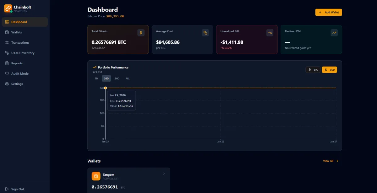 Chainbolt gives you full visibility into your Bitcoin holdings — without ever touching your private keys.